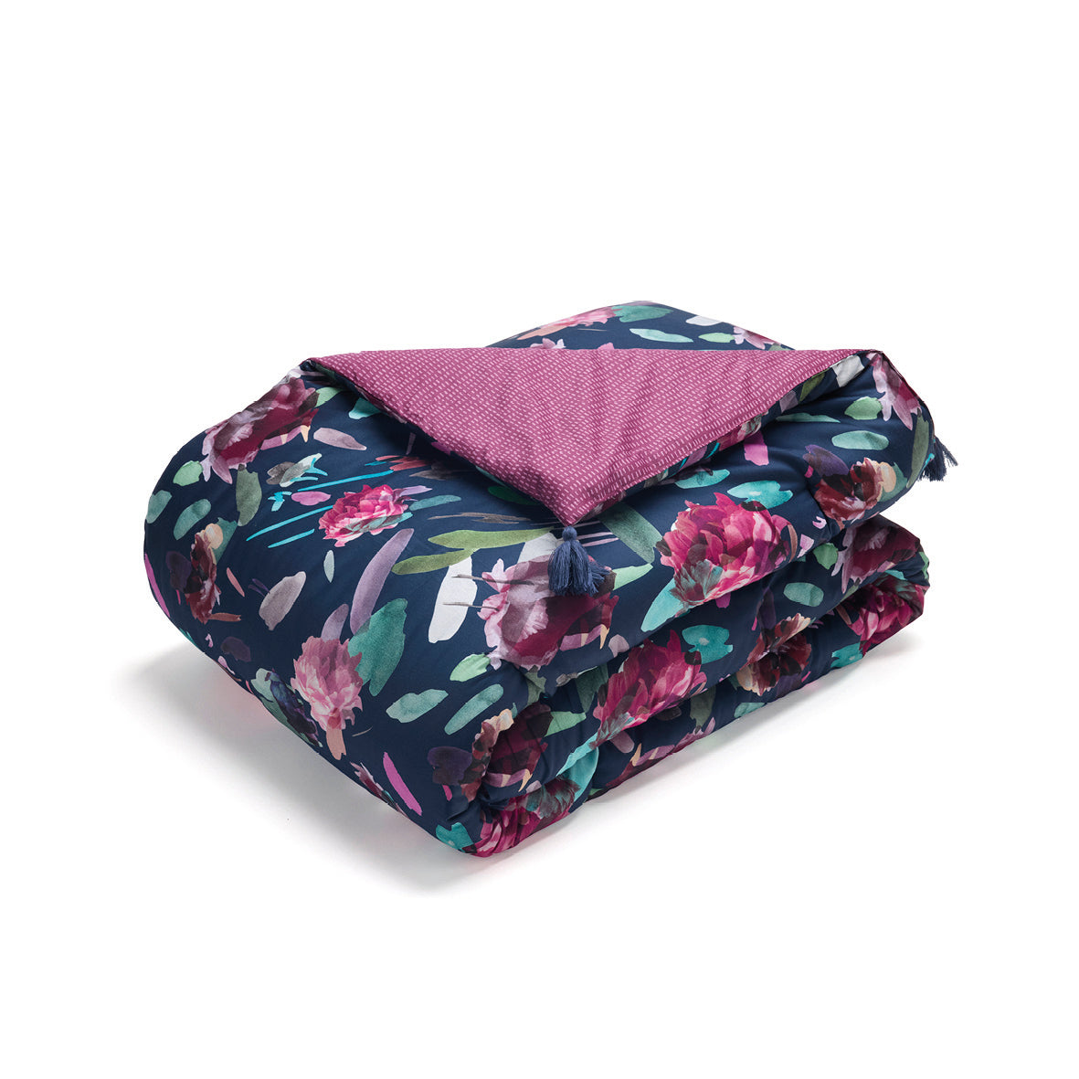 Édredon avec glands satin de coton Arty flowers Bleu foncé - 140 x 200 cm