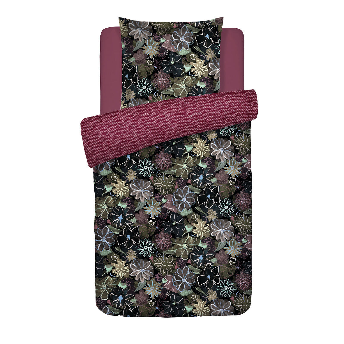 Housse de couette + taie(s) d’oreiller satin de coton - Fleurs pastel noir - 135 x 200 cm + 80 x 80 cm
