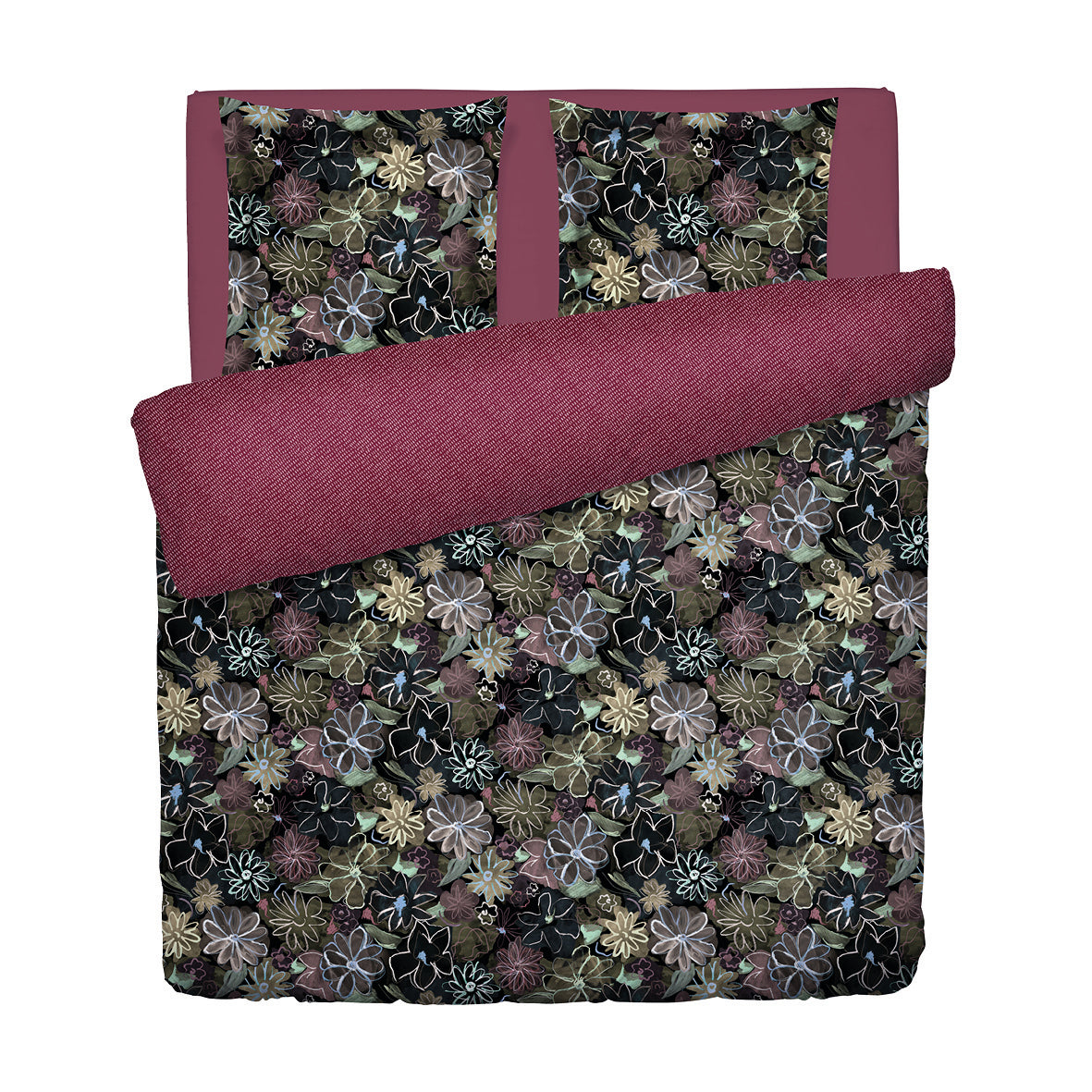 Housse de couette + taie(s) d’oreiller satin de coton - Fleurs pastel noir